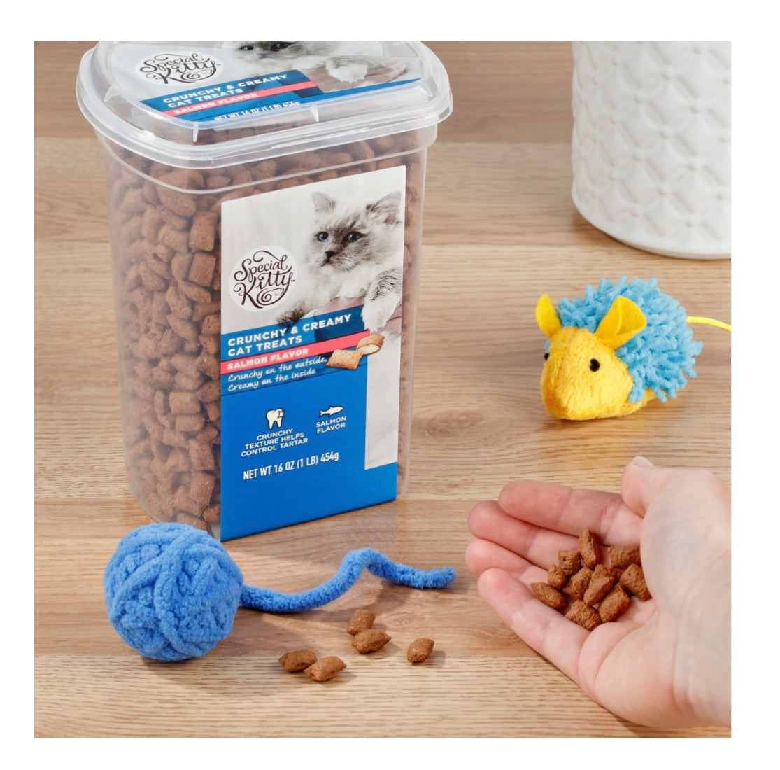 Your cat is special to you, so their food should be too. That's why we created a mouthwatering treat worthy of your cat, our Special Kitty Salmon Flavor Crunchy & Creamy Cat Treats. These tasty cat treats have a delightfully crunchy exterior and a soft, creamy center that your cat will ask for time and time again. Your cat will love the delicious salmon flavor of the cat treat, and you'll love that the crunchy texture helps control tartar to support your cat's dental health! With a 16-ounce reclosable container to help maintain the freshness of the treats, you can enjoy treating your cat to as many or as few treats as you decide. Pick up your cat's new favorite cat treats and bring home our Special Kitty Salmon Flavor Crunchy & Creamy Cat Treats today.